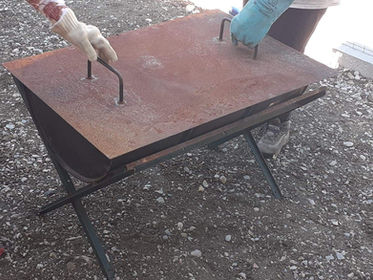 Il s’agit le plus souvent d’une faïence rouge tournée, trempée dans une engobe blanche, décorée avec des engobes colorés, cuite une première fois (dégourdi ou biscuit) vers 980/1020 degrés.